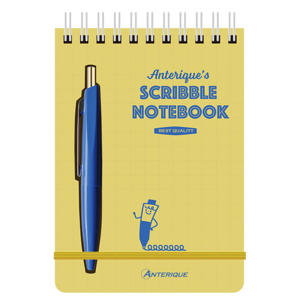 80 page spiral notebook with mini-ball pen stored within a cut-out in the pages (a clever transparent first page keeps the pen from falling out). Elastic closure. Choose 5" square size or NEW pocket size 3.5"x5". Colorful pages gridded on both sides. Mini ball pen uses refill ATR-BP10. Featuring the Anterique mascots. Made in Japan.