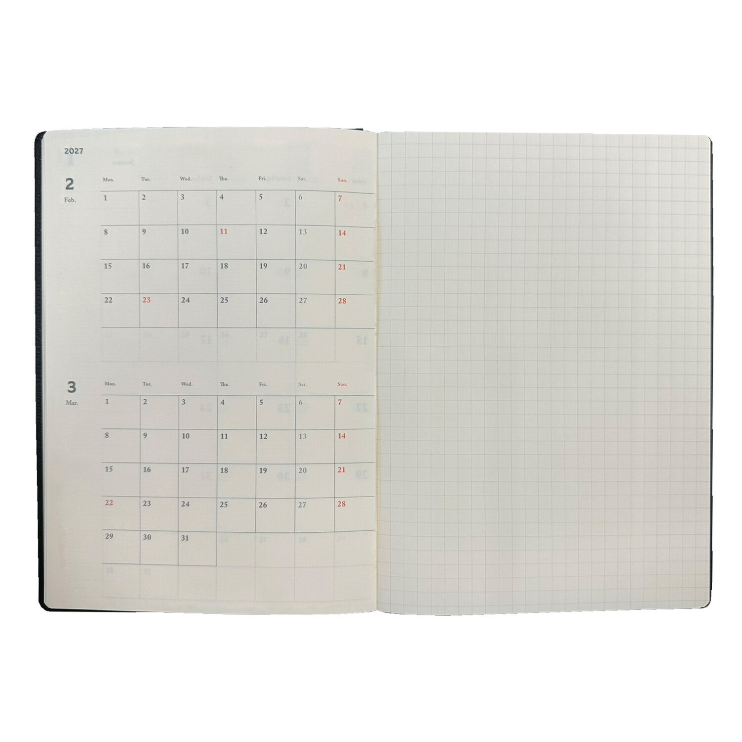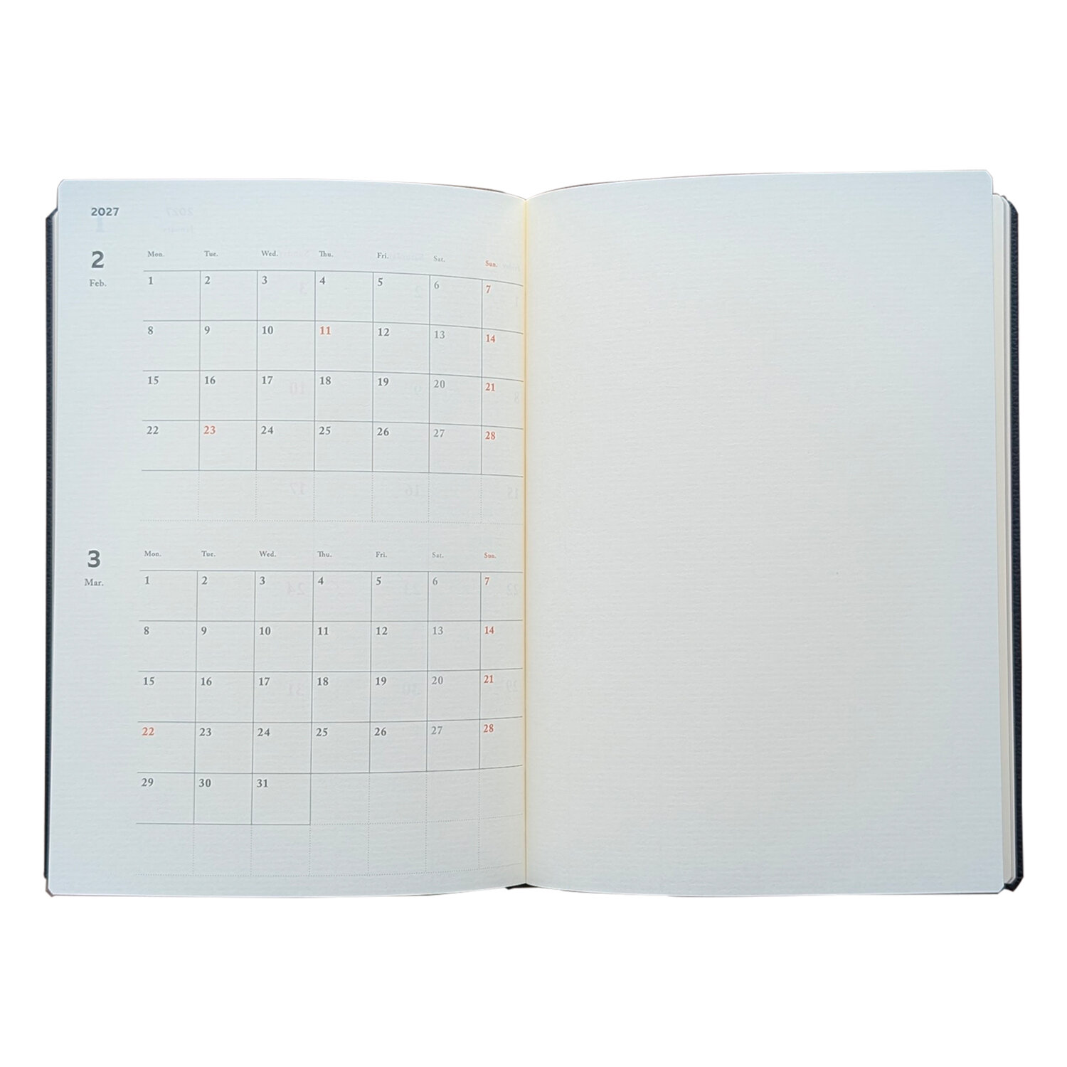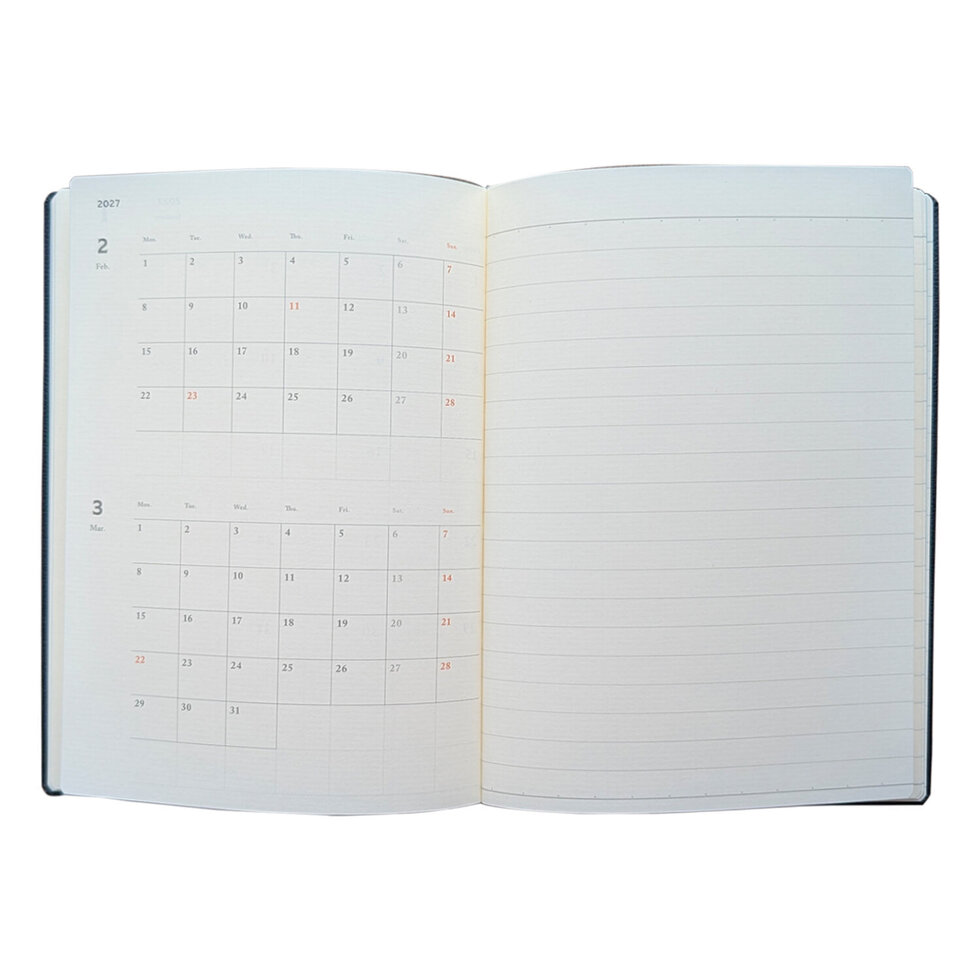 Includes overview of the 2026-2027 calendar year as well as 16 months of monthly planner pages (Dec 2025 to March 2027). Threaded binding. Original twill diagonal closure band. Two bookmarks (grey and black).