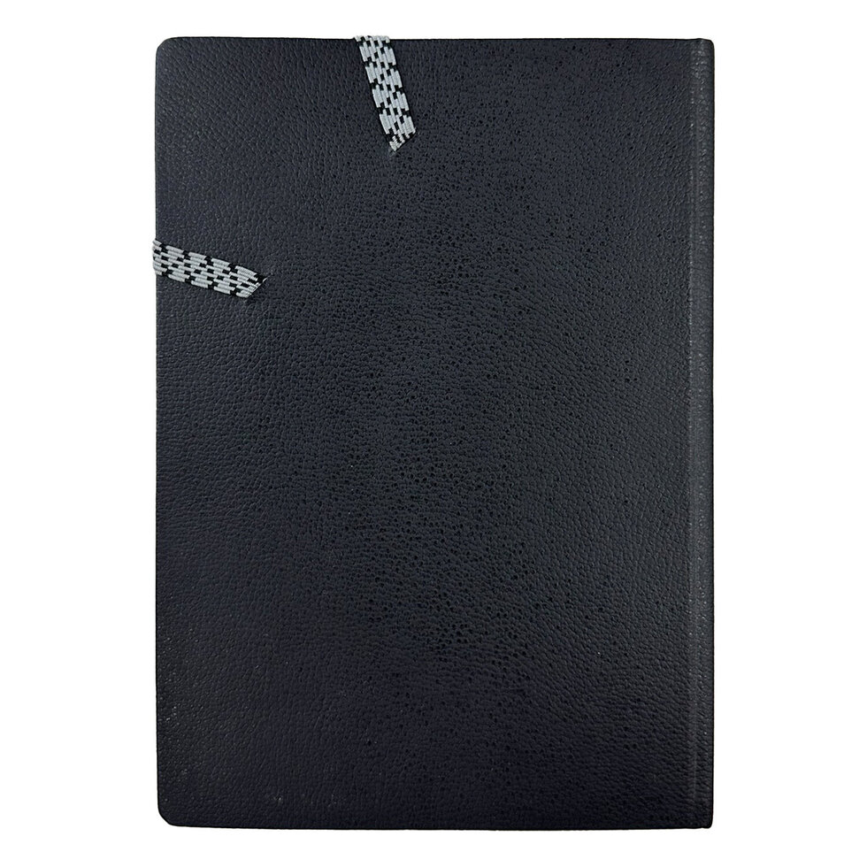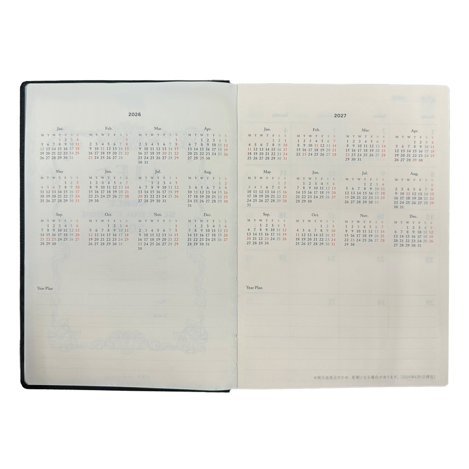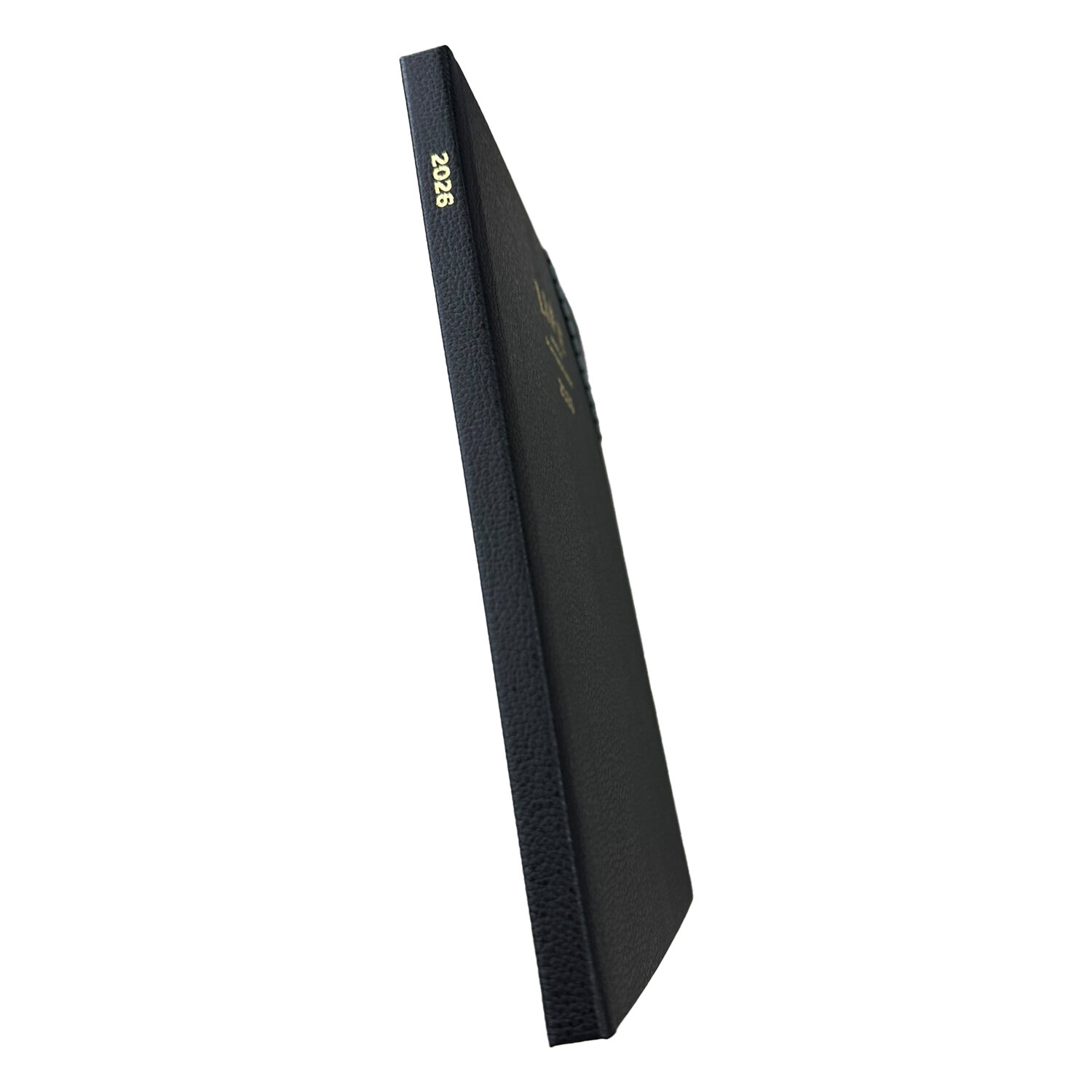 Includes overview of the 2026-2027 calendar year as well as 16 months of monthly planner pages (Dec 2025 to March 2027). Threaded binding. Original twill diagonal closure band. Two bookmarks (grey and black).