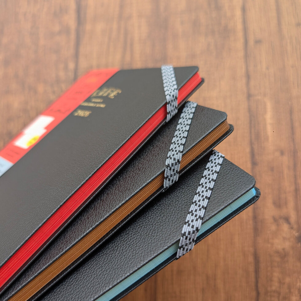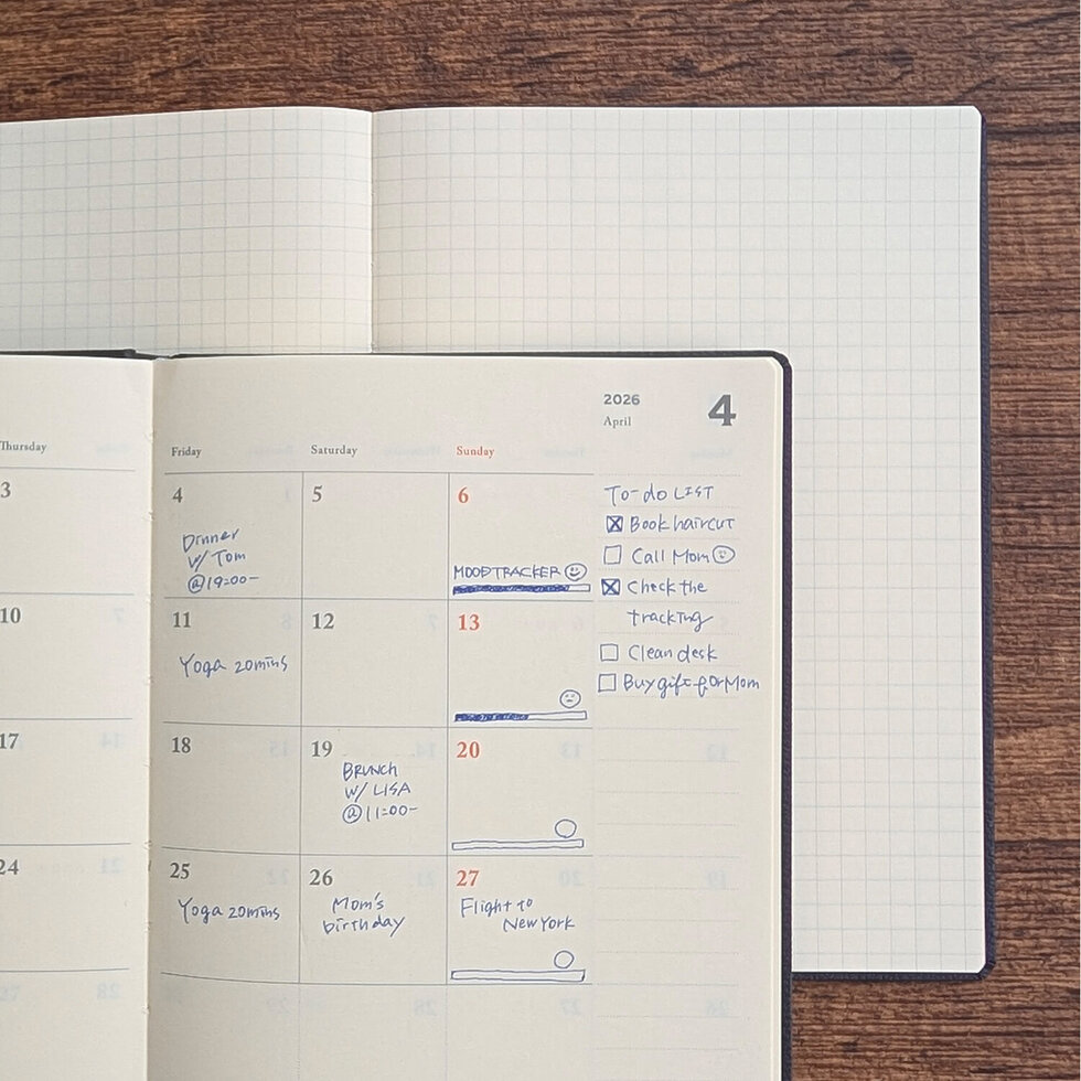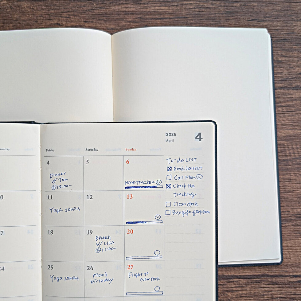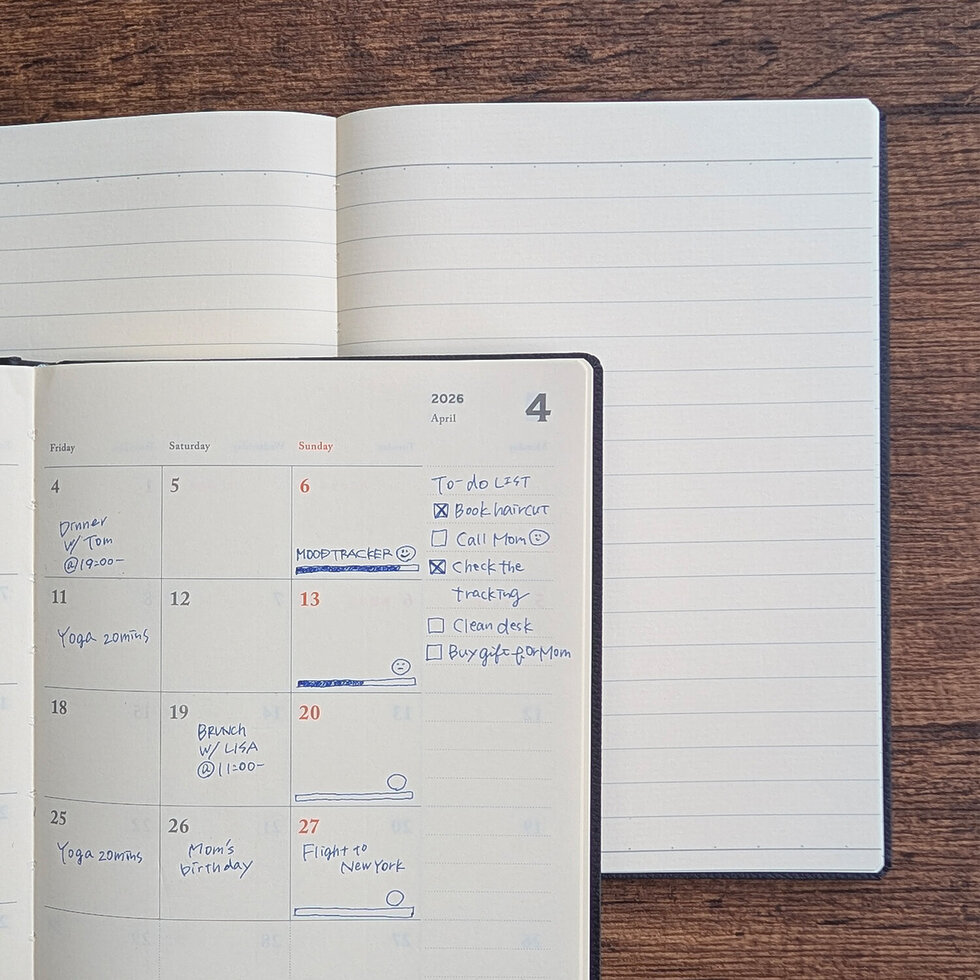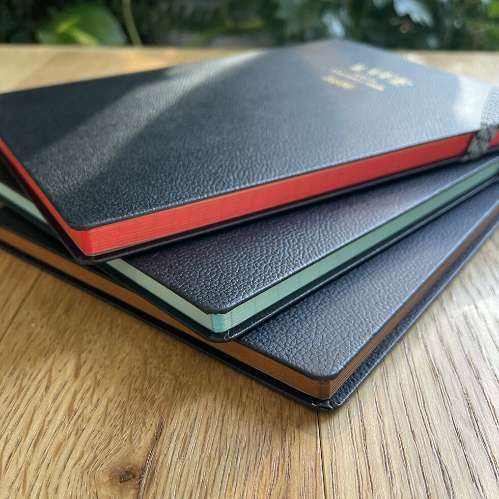 Gold-embossed, durable hardcover Noble schedule books featuring a simple design of calendar pages followed by a choice of plain, ruled or gridded pages made from proprietary "L" writing paper. Easy to carry B6 (5"x7") size.