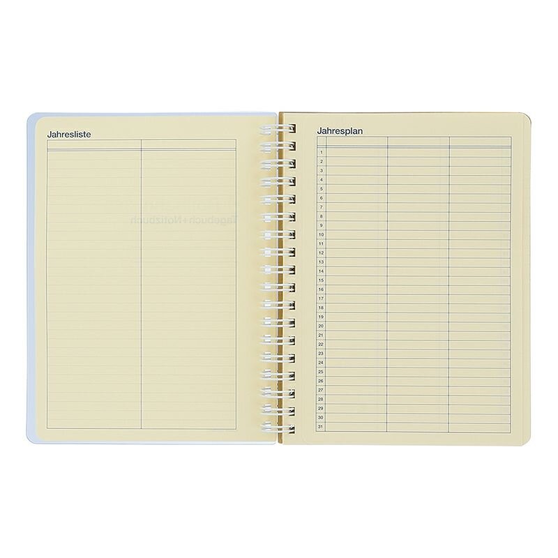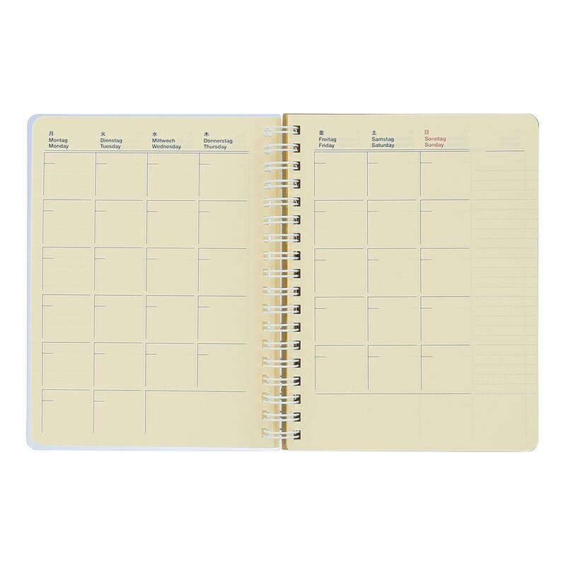 This is a "free" diary with an open dating system. The month and date fields are blank, so you can start using it whenever you like. There are 12 months of monthly pages, 1 year of weekly pages, 72 pages of Rollbahn grid and the usual Rollbahn clear pockets at the back.