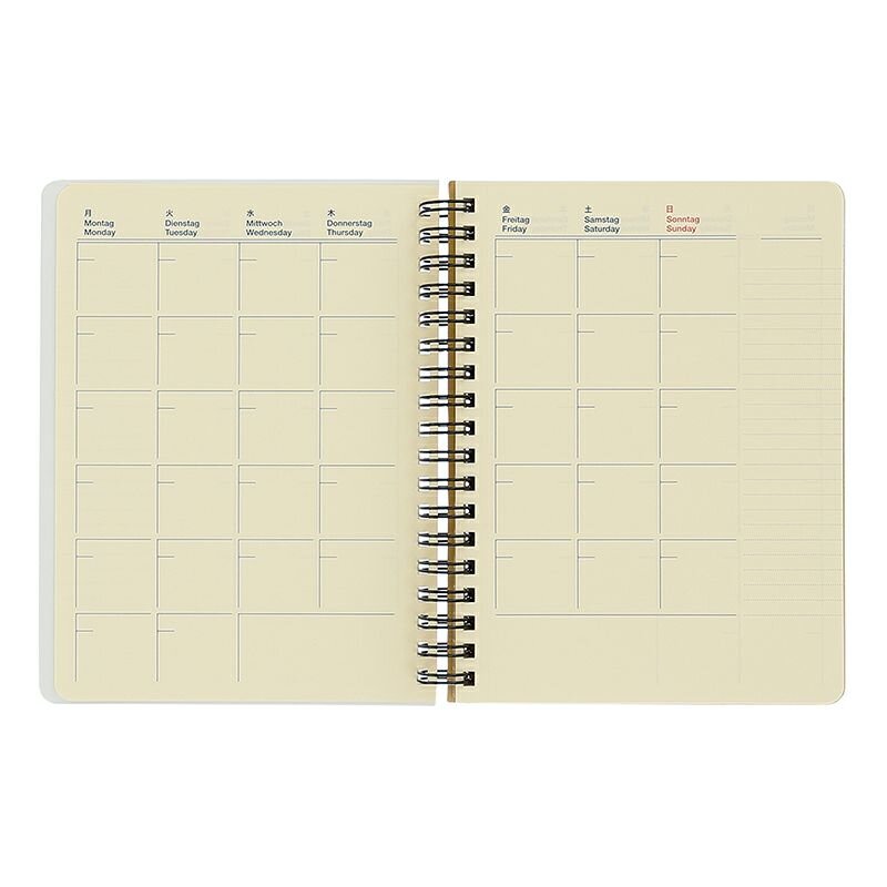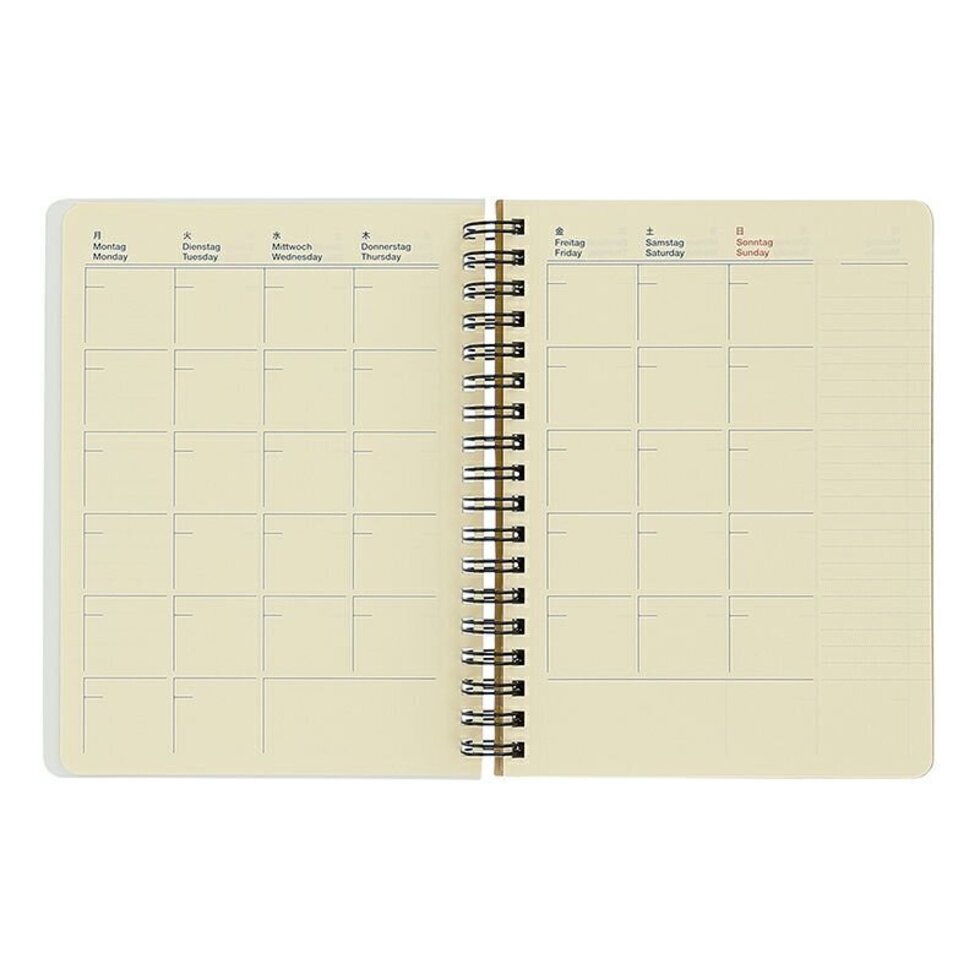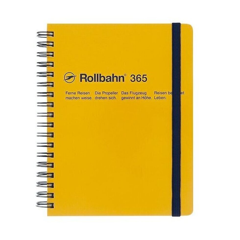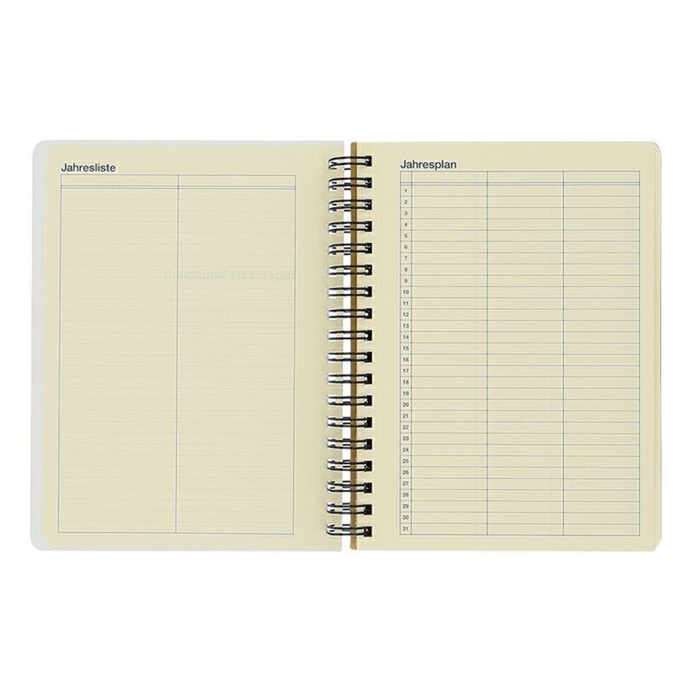 This is a "free" diary with an open dating system. The month and date fields are blank, so you can start using it whenever you like. There are 12 months of monthly pages, 1 year of weekly pages, 72 pages of Rollbahn grid and the usual Rollbahn clear pockets at the back.