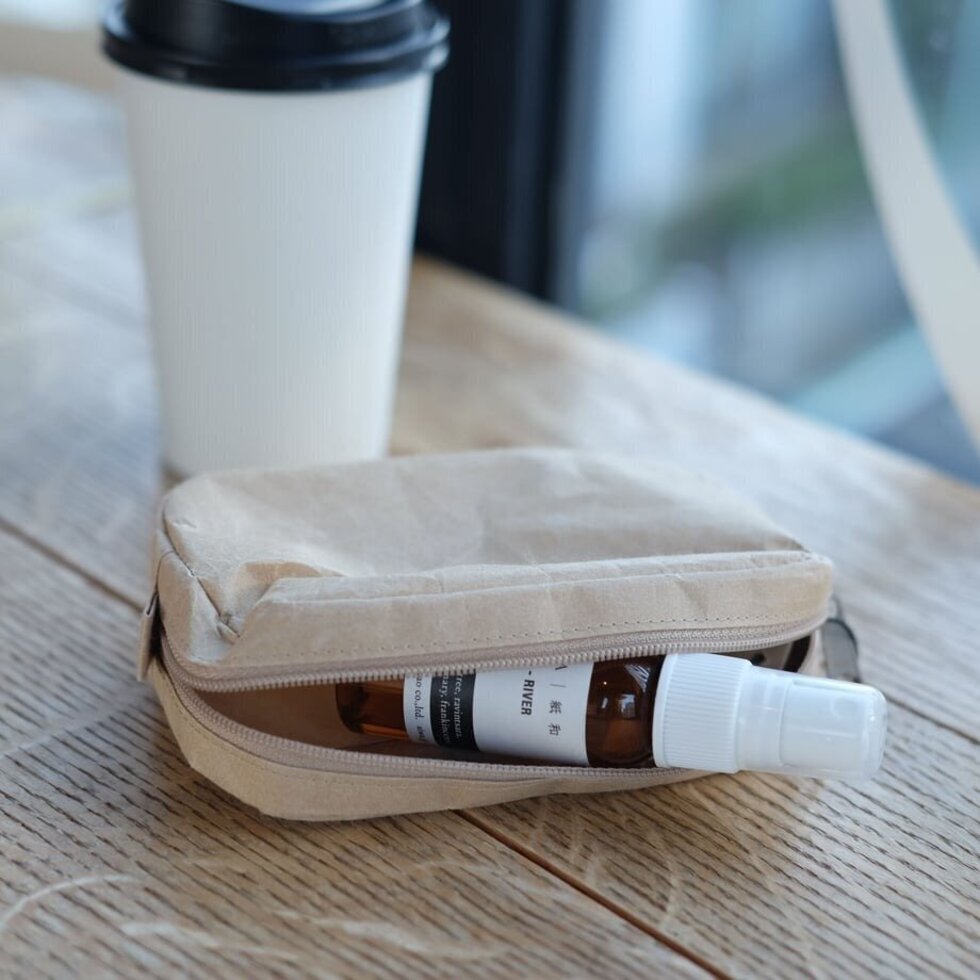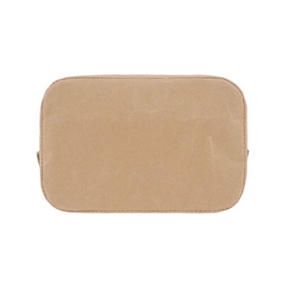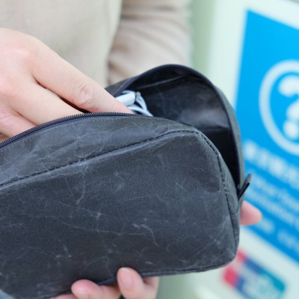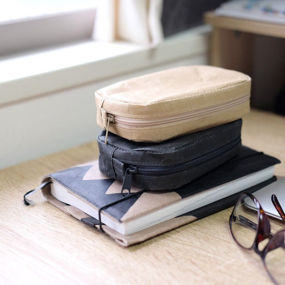The pouch is made from durable Japanese paper called "Soft Naoron." It feels nice to the touch and develops a beautiful texture the more you use it. Each pouch is handcrafted by artisans, and the beautiful stitching is a defining feature of this pouch. And best of all, it's lightweight - far lighter than pouches made from cloth or nylon.