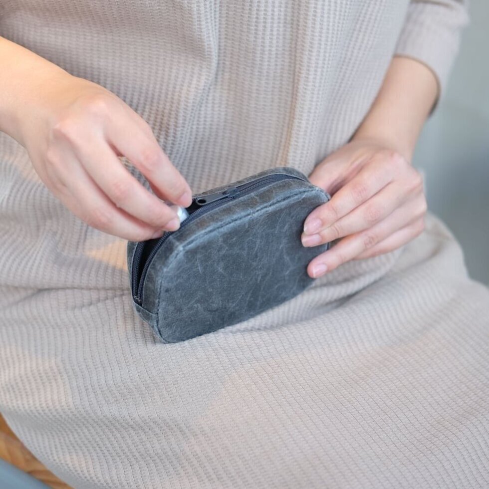 The pouch has pockets on the inside sides, allowing you to organize your belongings. A key feature is that the zipper can be opened all the way to the side of the main body. This allows the pouch to open wide, making it easy to take things in and out and quickly find what you need. There is a tab on the side to help open the zipper, so you can grab this and open and close it easily. The gusset is also wide, so it can hold more than its appearance would suggest.