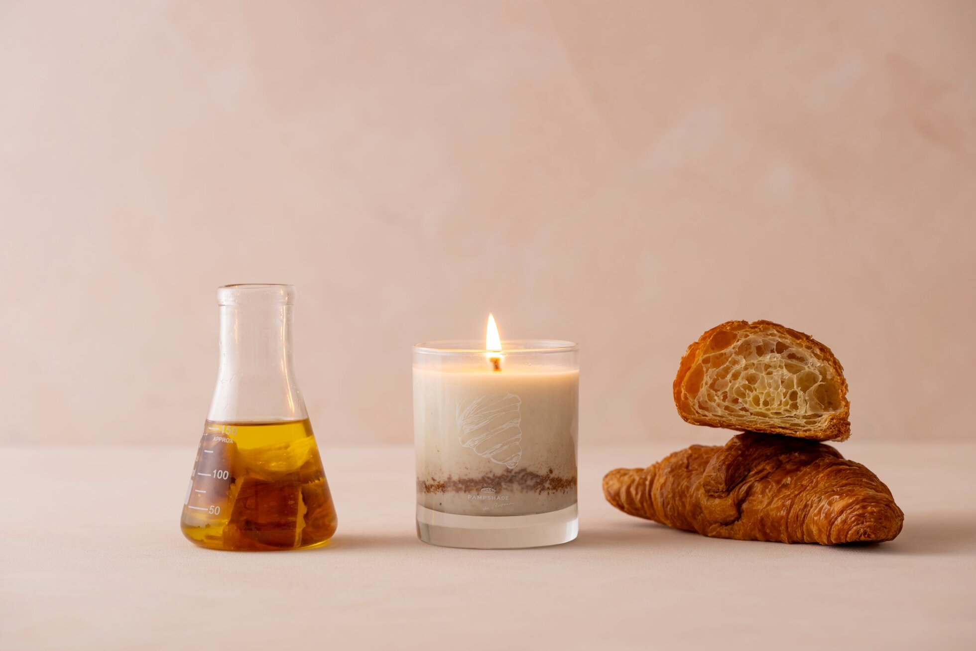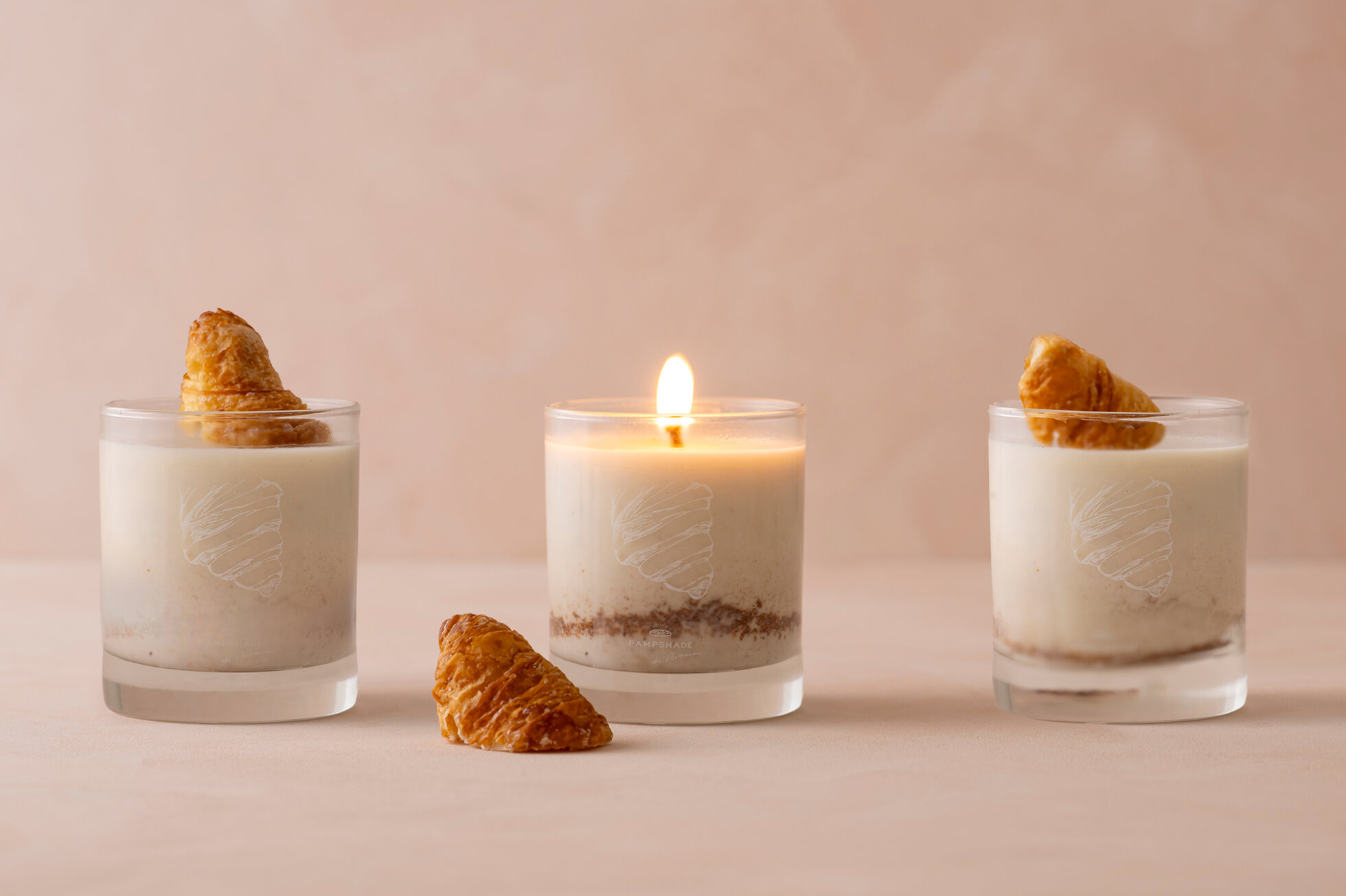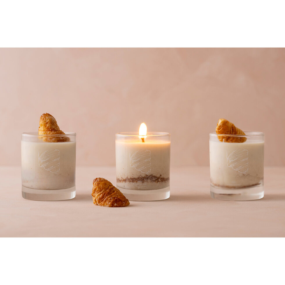 Two years in development with fragrance experts in Japan.. this croissant candle is remarkably scented with fragrance extracted from real croissants (like all Pampshade products, surplus bread that would have otherwise been discarded). It is believed to be the world’s first aroma candle created by extracting fragrance components from processed baked goods (patent is pending). The scent prior to lighting is milky and delicate sweetness.. during the lit period a gentle, rich fragrance of butter unfolds.. and when the flame is extinguished there is a warm aroma reminiscent of toast.
