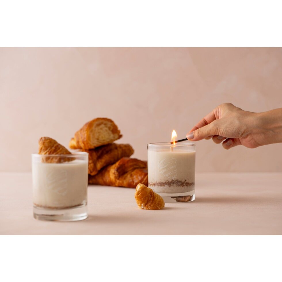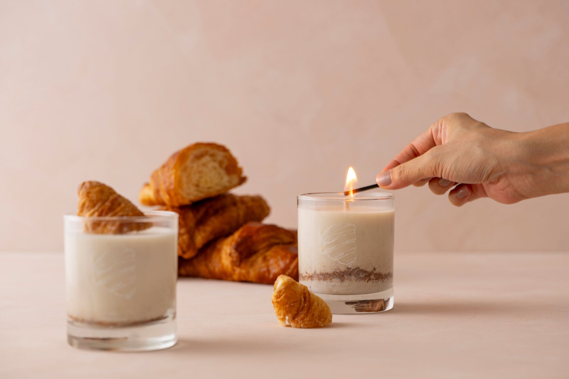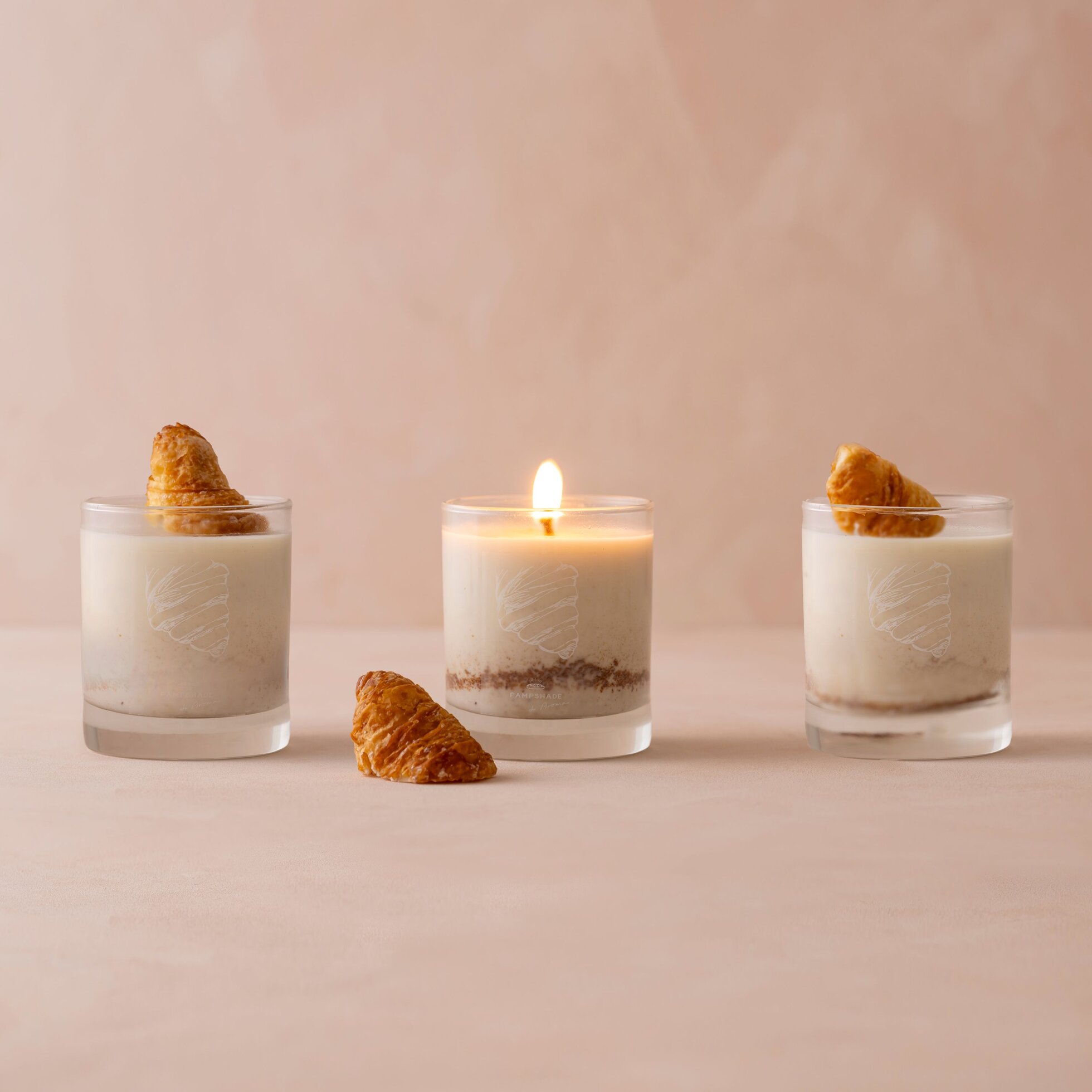 Two years in development with fragrance experts in Japan.. this croissant candle is remarkably scented with fragrance extracted from real croissants (like all Pampshade products, surplus bread that would have otherwise been discarded). It is believed to be the world’s first aroma candle created by extracting fragrance components from processed baked goods (patent is pending). The scent prior to lighting is milky and delicate sweetness.. during the lit period a gentle, rich fragrance of butter unfolds.. and when the flame is extinguished there is a warm aroma reminiscent of toast.