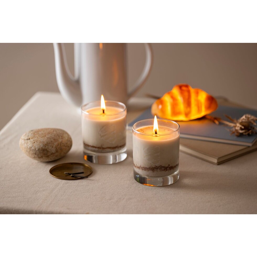 Packaged together with a croissant fragment on top (which is also a magnet). Glass jar. Approx 45 hour burn time. Mix of soy and bee wax (paraben-free). Glass size: 3" diameter x 3.5" height.